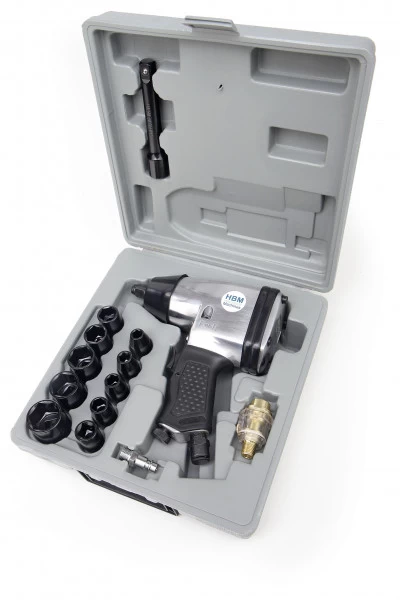 De HBM 17 Delige 1/2″ Slagmoersleutelset bestaat uit een 1/2″ slagmoersleutel van zware kwaliteit en heeft een verstelbaar koppel tot 340 Nm. Dankzij de Links / Rechts schakeling werk je extra makkelijk met de set en de slagmoersleutel is voorzien van softgrip. De HBM 17 Delige 1/2″ Slagmoersleutel heeft een gewicht van 2200 gram en een maximale NM van 340. De machine is eenvoudig en snel aan te sluiten op een compressor slang. Met de tool maak je binnen no-time een moer los of maakt deze los.
