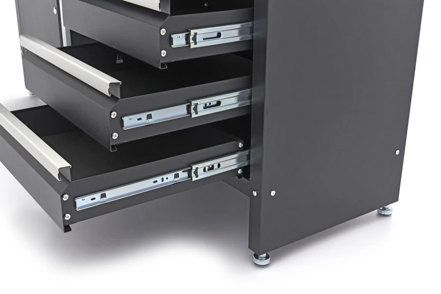 De deur van de kast is af te sluiten, zodat je daar je gereedschap en onderdelen veilig op kunt bergen. En de laden beschikken over solide, kogelgelagerde geleiders die dubbel zijn gelagerd, waardoor ze vlot en zonder problemen geopend kunnen worden. De werkbank heeft een hoge maximale belading van 600 kg, waardoor je allerhande soorten klussen kunt uitvoeren.