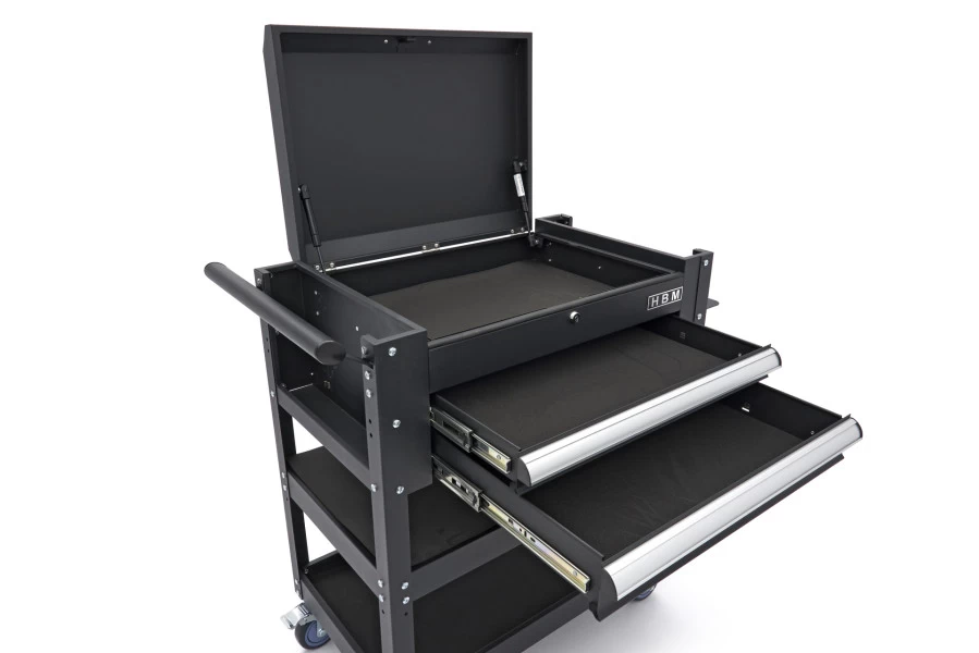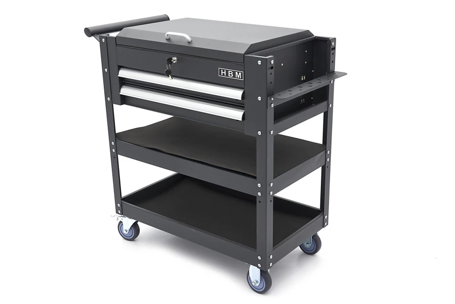 Een opgeruimde werkplaats of garage is te realiseren met deze HBM 2 Laden Gereedschapswagen Met 2 Plateaus en Opbergvak. Al je gereedschap netjes opgeborgen in deze solide en stevige gereedschapswagen,
