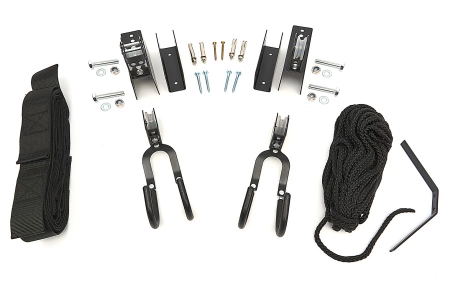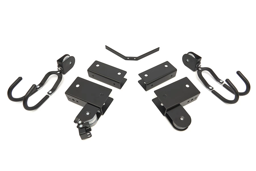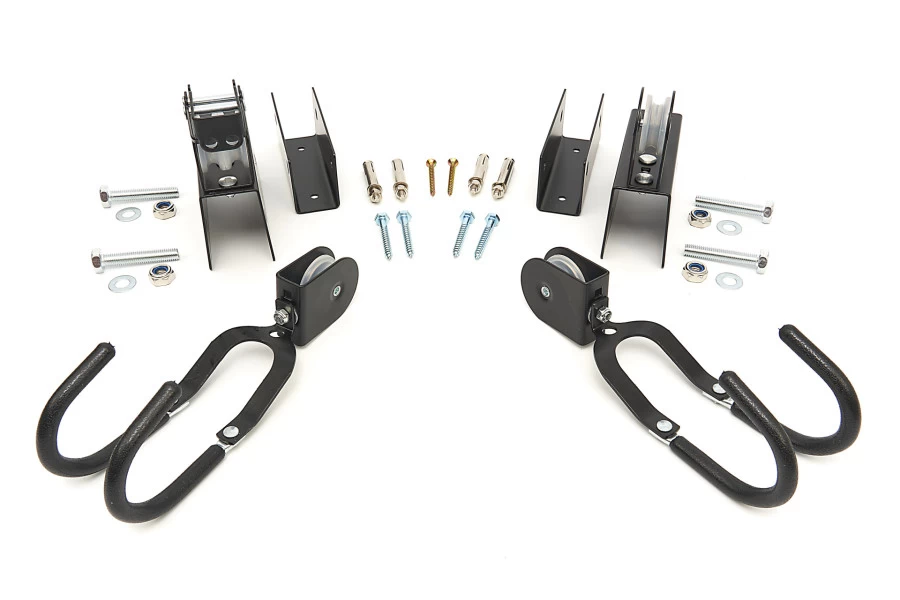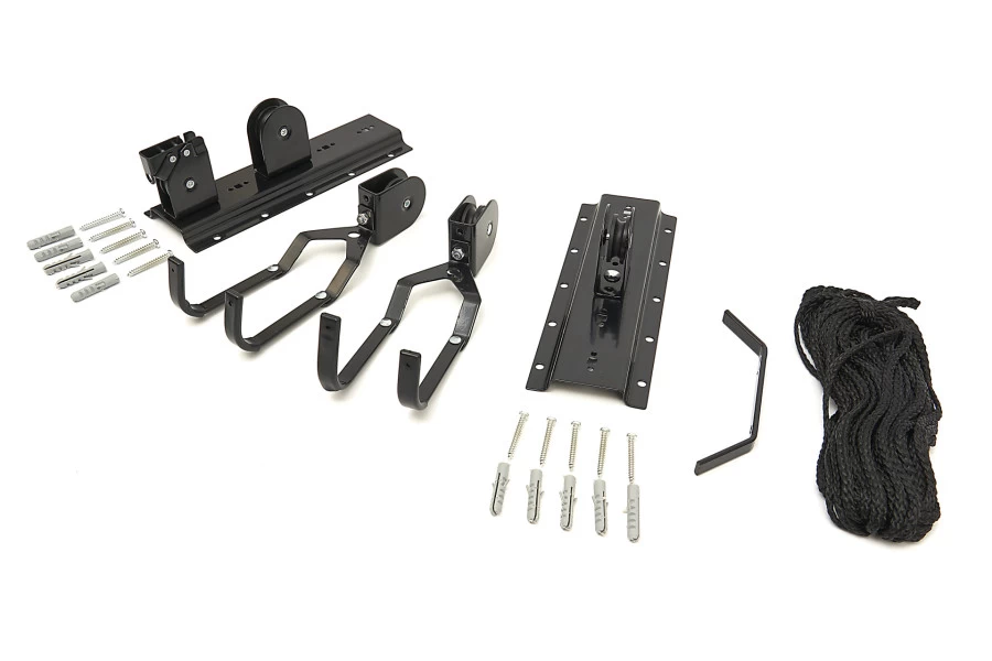 Met deze fietslift kan je elke fiets* ophijsen aan het plafond van je garage, schuur of fietsenhok. De kracht die je daarbij nodig hebt is dezelfde als voor het ophijsen van ¼ van het gewicht van de fiets, doordat er twee katrollen zijn gebruikt bij deze fiets hijsinrichting.