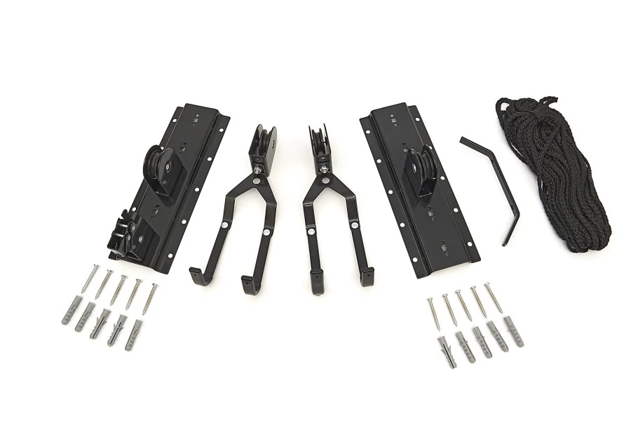 Het meegeleverde Nylon koord loopt soepel door de katrollen heen, maar als je de spanning van het koord laat wegvallen, wordt het koord automatisch geblokkeerd, waardoor de fiets veilig blijft hangen. Met een klein rukje aan het koord, is de blokkade weer opgeheven en kan je de fiets weer langzaam naar beneden laten zakken.