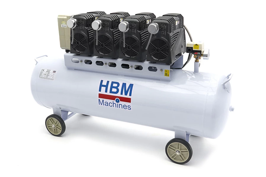 Deze stille olieloze compressor heeft 4 motoren met in totaal 8 (grote) cilinders die tezamen slechts een geluidsniveau van 68 dB genereren! De acht cilinders van deze compressor maken een voor een low noise compressor relatief grote slag, met als gevolg dat deze compressor sneller zijn maximale druk bereikt dan menig andere low noise compressor. (De maximale druk ligt meestal zo’n 2 bar hoger dan de nominale werkdruk en de meeste andere low noise compressoren doen er vrij lang over om deze maximale druk te bereiken). De 200 liter druktank zorgt voor een flink perslucht buffer, waardoor de compressor niet snel zal aanslaan. Dit zorgt dus voor een korte duty cycle van de machine. De motorcontroller start alle vier de motoren één voor één na elkaar op om overbelasting van het stroomnet te voorkomen. Ook wordt een overbelaste motor door de controller automatisch uitgeschakeld, totdat iemand weer op de reset knop drukt