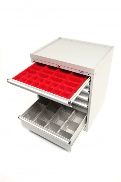 Deze robuuste en professionele gereedschapskast is zowel voor het opbergen van onderdelen als gereedschap te gebruiken. Je plaatst de kast gemakkelijk onder de werkbank, zodat je kleine veelgebruikte onderdelen altijd direct bij de hand hebt. Natuurlijk kun je de kast ook inrichten met gereedschap. Hiervoor zijn in de webshop foam inlays te verkrijgen die je zelf kunt uitsnijden. Zo wordt het gereedschap altijd netjes en veilig op een vaste plek opgeborgen.