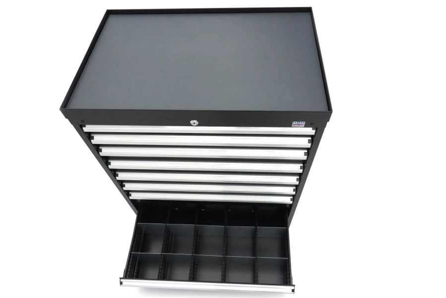 Met deze HBM gereedschapskast met bakjes en tussenschotten haal je topkwaliteit in huis. De kast wordt zowel ingezet in mechanische als elektronische werkplaatsen en voor gereedschappen en kleine onderdelen. Door de stevige uitvoering kan de kast ook tegen een stootje. Alle laden zijn voorzien van een lift-up slot. Daarnaast heeft de kast een centraal slot, waarmee aan het eind van de dag alle laden worden afgesloten. De gereedschapskast heeft een werkblad met opstaande rand.