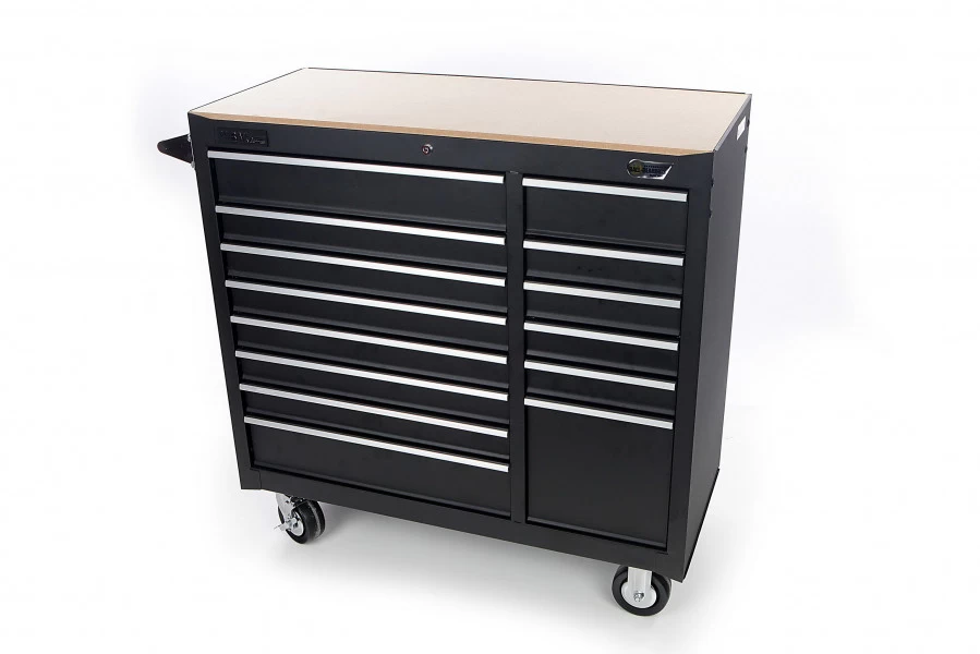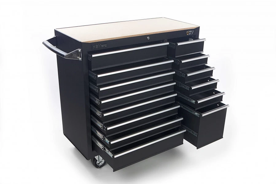Ontdek de ultieme oplossing voor professionele vakmensen de HBM Gereedschapswagen met 14 Laden in elegant zwart, met een breed scala aan functies die je werk efficiënter maken. Deze robuuste gereedschapswagen komt standaard met solide kogelgelagerde geleiders, waarbij de 6e lade aan de rechterkant zelfs is uitgerust met 4 geleiders voor extra stabiliteit. Elke lade is voorzien van een antislipmat om je gereedschap veilig op zijn plaats te houden. Het MDF houten bovenblad biedt niet alleen een professionele uitstraling, maar ook extra werkruimte voor kleine klussen.