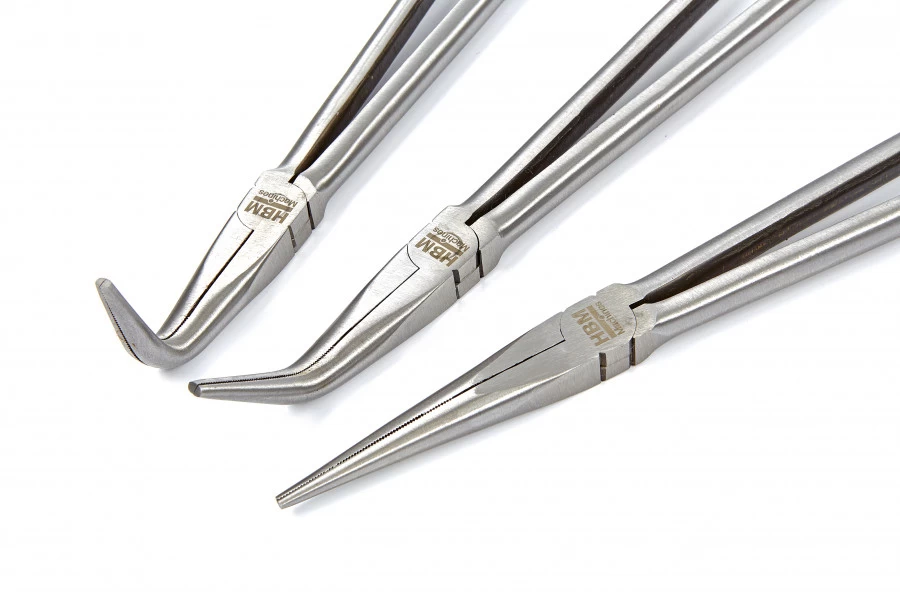 De bek van de eerste tang uit deze set heeft een rechte punt. Hiermee knip je allerlei dun materiaal door. De bek van tang twee heeft een punt van 45 graden en is daardoor geschikt voor het grijpen van kabels en draden die op de wat lastige plekken zijn gesitueerd. De derde lange tang heeft een bek van 90 graden, hiermee grijp je draden die nog moeilijker bereikbaar zijn.