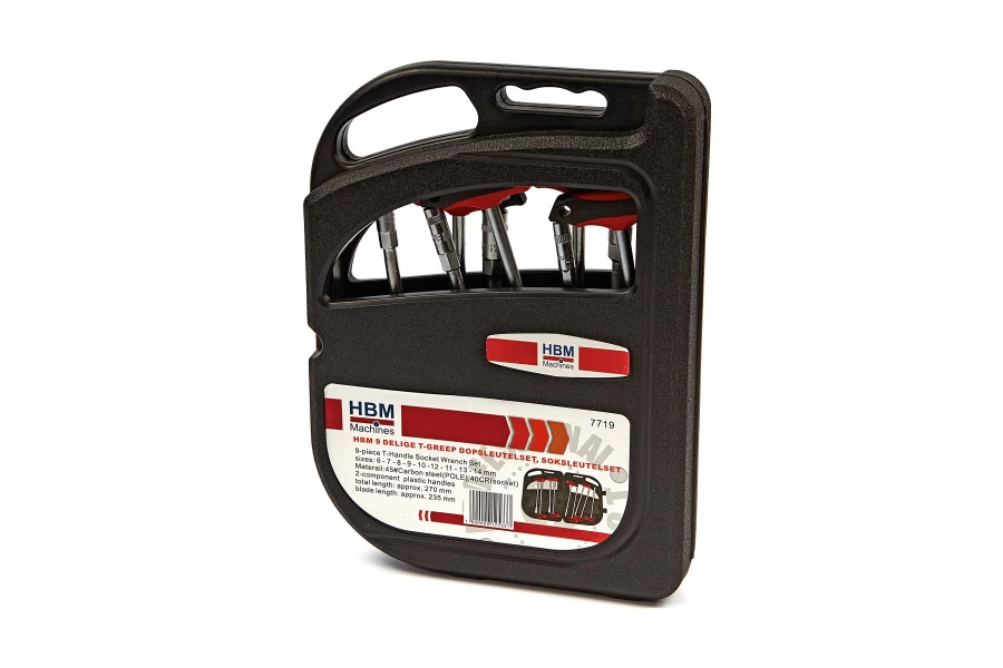 Met deze handige HBM 9-delige T-greep dopsleutelset, soksleutelset kan je de meeste bouten en moeren goed los- of vastdraaien. De set bestaat uit negen verschillende dopsleutels met T-greep. Dankzij deze T-greep kan je extra kracht zetten zonder dat je daar veel moeite voor hoeft te doen. De set zit verpakt in een heel stevige kunststof blister, zodat je je gereedschap netjes bij elkaar kunt bewaren.