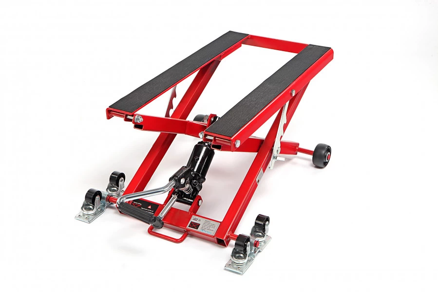 Als je regelmatig aan je motor sleutelt, mag deze brug niet in je werkplaats ontbreken. Hij is veilig, stabiel en gemakkelijk te bedienen. Zo kun je op een prettige hoogte reparaties uitvoeren of een band verwisselen. Uiteraard is de lift ook te gebruiken bij het schoonmaken van je motor. En door zijn compacte formaat heb je er altijd wel een plekje voor. Behalve in rood is deze mobiele motorlift ook verkrijgbaar in zwart.