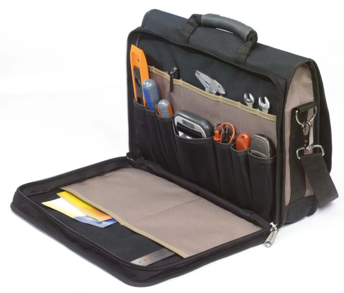 Deze gereedschap- en documenten schoudertas is gemaakt van stevig polyester (600D). De stof is licht van gewicht en duurzaam in gebruik. Het voorvak is vooral geschikt voor het opbergen van documenten en kleine gereedschappen. In het ruime hoofdvak kunnen zowel gereedschappen als documenten en accessoires worden opgeborgen. Deze schoudertas heeft in totaal 30 verschillende opbergmogelijkheden. De schouderband is afneembaar en gewatteerd voor extra comfort.